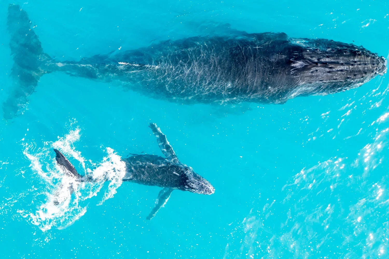 Nach dem Abflauen des Windes konnten wir am Tag 2 beider Wochen auch wieder aufs Meer, wo die Interaktionen mit den Buckelwalen sogleich begannen! In beiden Wochen konnten wir sowohl am ersten Tag, wie auch an jedem darauffolgenden Tag tolle Interaktionen unter der Wasseroberfläche erleben. Das Highlight der Woche 1 waren eine Gruppe von 6 Walen, sowie eine wunderschöne Begegnung mit Mutter, Kalb und Escort. Der Escort begann sogar zu singen, während die 3 Wale ganz langsam an uns vorbei schwammen.